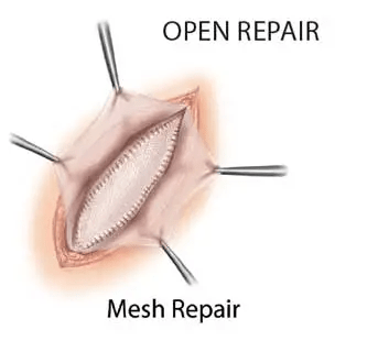 - In this procedure after the replacement of the protruded tissue or organ, a mesh is placed over it and then sutured.