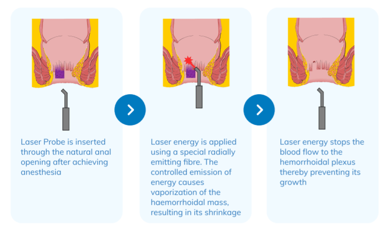 In the case of Laser Hemorrhoidoplasty, the laser surgery for piles is a simple and a straightforward one. It is a minimally invasive method and this is an overview of the surgery: