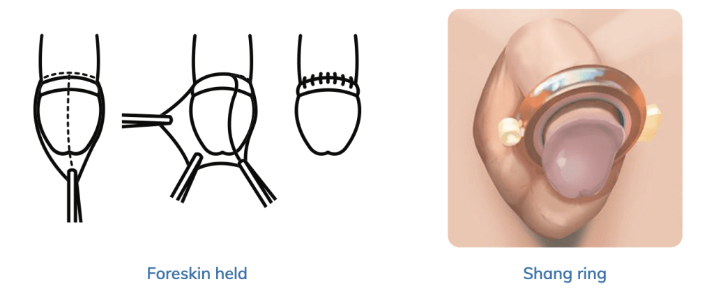 This type of circumcision involves pulling out of foreskin and opening the same with a clamp. The doctor then removes the adhesion between the glans and foreskin, then detaches the foreskin. For better coverage, he may place a circumcision device such as a plastibell, Shang ring or a gomco clamp. While this happens after giving local anaesthesia to the patient, shang ring serves as a device for better coverage.