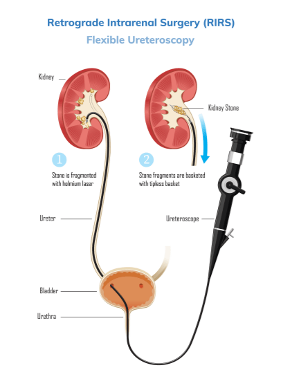 As the name suggests, RIRS – Retrograde Intrarenal Surgery, is a procedure involving the removal of kidney stones by entering the kidney from the ureter, in a reverse i.e., retrograde manner. It involves the use of a fibre-optic endoscope for visual directions and a Holmium laser to break down the stones into small fragments. RIRS is one of the most advanced, and effective kidney stone surgery ensuring the least complications.